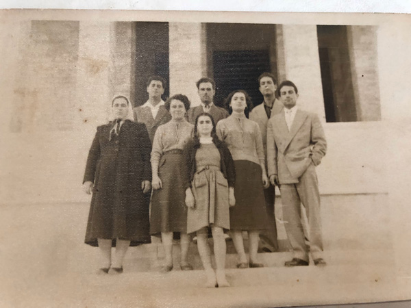 İkinci resim bana Halil Amcanın eşi Nafiya Yenge tarafından ulaştırıldı. Resimde tanımadığım üç genç adam, Halil Amca ve eşi Nafiya Yenge var. Nafiya Yenge yakası fiyonklu bir bluz ve pileli etek giymiş. Halil Amca ceket ve koyu renk bir süveter giymiş. Merdierdivendeki adamlardan biri arkadaki diğer ikisi öndeki basamağa oturuyorlar. İki adamın elinde valiz var. Herkes mutlu şekilde objektife poz vermiş olsa da valizlerden dolayı bir ayrılış resmi olduğu anlaşılıyor. Muhtemelen kapının önünde duran araç genç adamları bekliyor ve o gün otelden ayrılacaklar. Ve yine büyük olasılıkla bu araç Cadillac. Bin dokuz yüz ellili yılların Cadillac modellerinin arka aksamıyla aynı görüntü fotoğraftaki aracın tampon kısmının görüntüsü. Annemin Halil amcasının eşi Nafiya Yenge’ye bu resimdekilerin kimler olduğunu soruyorum.