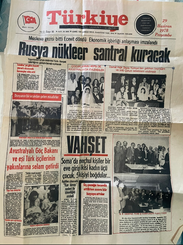 Keriman teyzemin resmini görmek için baktığım gazete sayfası tarihsel gerçeklere ışık tuttuğu gibi o günün koşullarında Avustralya’da yaşamakta olan Türklerin yaşamlarından kesitler sunuyor. Bu sayfadan o tarihte gazetenin 20 Sent olduğunu öğreniyoruz. Gazetenin büyük puntolarla atılmış manşetinde “Rusya Nükleer Santral Kuracak” haberi var. Onun üzerinde “Moskova gezisi bitti, Ecevit döndü, Ekonomik iş birliği anlaşması imzalandı” manşeti daha küçük harflerle yer alıyor. Bu arada düğünler, taverna eğlenceleri, kumara tövbe etmeler gibi cemiyet hayatına ait ufak bilgiler de arka sayfadaki satırlar arasında yer alıyor.