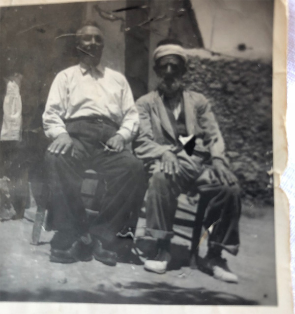 Annem bazı mektupları resimleriyle saklamış. Bu resim annemin babası ve dedesinin birlikte resmi olduğu için önemli. Baba oğul güneşli bir günde surlar içindeki taş evin avlusuna tahta sandalyelere oturmuş ve aynı pozu vermişler objektife doğru. Her ikisi de ellerinin dizlerinin üzerinde duruşu, ayaklarının açısı ile birbirlerini aynalıyorlar. Büyük Dede Türkiye’den gelen oğlunu görmekten mutlu. Yılların yorgunluğunu taşıyan omuzların altındaki bedeni oğluna yaslanmış. Büyük dedenin başında Lala Mustafa Paşa camiinde müezzinlik yaptığı için sarığı ve üzerinde cüppesi var. Belki de biraz sonra caminin minaresine çıkıp ezan okuyacak olduğu için bu kıyafet üzerinde (Büyük dedenin o ileri yaşına rağmen merdivenleri tırmanıp minareden ezan okuması annem ve teyzelerim tarafından anlatılanlar arasında). Arkadaki kapıdan görünen ancak yüzü gölgede kaldığı için kim olduğu seçilemeyen beyaz kıyafetli kişinin, albümde yer alan diğer giysilerine benzeterek annem olabileceğini düşünüyorum. Dedemin Mağusa ziyaretinde çekilen ve kendisine ulaştırılması için mektupla gönderilen bir resim olmalı bu resim.