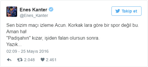 NBA’de Oklahoma City Thunder forması giyen Enes Kanter, sosyal medya hesabından attığı sert tweetlere bir yenisini daha ekledi. Enes'in hedefindeki isim bu kez de Acun Ilıcalı oldu.