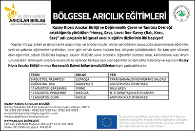 Tüm kayıtlı arıcılara ve arıcılık ile ilgilenen her kese açık olan eğitimlerle ilgili daha fazla bilgi ve kayıt için Kuzey Kıbrıs Arıcılar Birliği’ne telefon veya e-mail yoluyla ile ulaşabilecek.