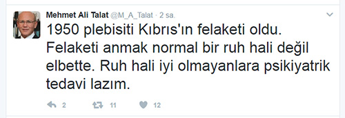 '1950 plebisiti Kıbrıs'ın felaketi oldu. Felaketi anmak normal bir ruh hali değil elbette. Ruh hali iyi olmayanlara psikiyatrik tedavi lazım.'