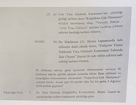 Olmaz demeyin oldu, hükümet çekler konusunda geri adım attı ve bugünden itibaren Bankaya gelen çekler eğer karşılığı yok ise direk karşılıksız mühür yiyecek 15 gün sonra ödenmezse de çek yasağına sokulacak kişiler. Hali hazırda pek çok işletme henüz kapılarını açmadı. İki aydan fazla bir süreden bu yana işyerini açamayan bu işletmelerin piyasada olan çekleri bugünden itibaren bankalarda işleme sokuluyor Bakanlar Kurulu Kararı ile. Bu yöndeki adımı atan bakanlar kurulu pek çok işletmenin daha iş yerini açamadan batmasına neden olabilir. Ekonomi uzmanları hükümetin bu adımı nasıl attığı konusunda şaşkınlar. Çünkü normalleşme süreci tamamlanmadan alınan bu karar pek çok iş yeri sahibinin çek yasağına girmesine neden olacak bir gelişme olarak görülüyor. İşte bu konuda Bakanlar Kurulu tarafından alınan o kararın belgesini sizlere sunuyoruz.