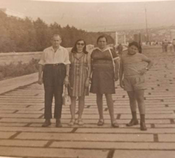 İlk resim Murat Amca, eşi ve Hasan Kıbrıs’tan Ankara’ya geldiklerinde; Anıtkabir’in çimenli taşlarla döşeli Aslanlı Yol’unda çekilmiş. Resimde sağdan sola sırasıyla; Murat amca, annemin ablası Fatma Teyzem, Murat amcanın eşi Vahide Yenge ve oğlu Hasan var. Bir de Fatma Teyzemle Vahide Yengenin omuzları arasından Aslanlı Yol’un aslanlarından biri baş gösteriyor. Arkada Anıtkabir’in bayrak direği ve daha arkada Ankara silueti görülüyor. Siyah beyaz resimde belli olmasa da teyzemin o gün giydiği kıyafet boyuna kahverengi çizgileri olan taba rengi bir elbise. Teyzem amcasını ve ailesini kendisinde kaldıkları süre içinde Anıtkabir’e, Botanik Parkı’na ve alışverişe götürüyor. Her geldiklerinde olduğu gibi biz de şehir dışından onları görmeye Ankara’ya geliyoruz.