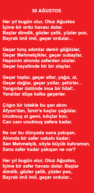 26 Ağustos 1071 Malazgirt Zaferi nasıl ki, Anadolu kapılarını Türk atlılarına açmışsa; 30 Ağustos 1922 Kurtuluş Zaferi de, genç, dinç, modern ve dinamik yeni Türkiye’nin kuruluş müjdecisidir.