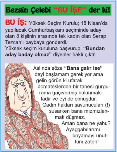 - Cumhurbaşkanı adaylarından Serap Tezcan bizim gazeteye özel açıklamalarda bulunmuş. “Diğer adaylardan da oy istiyorum. Hatta para da istiyorum. Çünkü benim gibi bir aday daha yoktur” demiş ama YSK adaylığını bile kabul etmemiş.