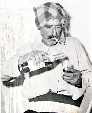 Fotoğrafta görülen Ali Muharrem, Limasol’a bağlı bir Türk köyü olan Mersinli’de (Aytuma) yaşamaktaydı.1974’te Türkmenköy’e (Gondeya) yerleştikten sonra, geçimini çobanlık ve cambazlık (hayvan alıp satma) yaparak sağlamaya başladı Yeme içme ve muhabbeti çok seven Ali Muharrem’in hayatı dolu dolu geçti. Fakat ölümü trajik oldu. 1979’da Türkmenköy’deki evinde ölü olarak bulundu. Parası için öldürüldüğü söylendi. Failleri hala bulunamadı. Dört çocuğundan üçü Türkmenköy’de, diğeri ise Londra’da yaşıyor. Fotoğrafta başında sarığı, belinde kuşağı ve dizliğinin bir kısmı ile görülen Ali Muharrem; içkisini bodirisine( küçük içki bardağı ) dökmekte ve sigarasını da keyifle tüttürmektedir.